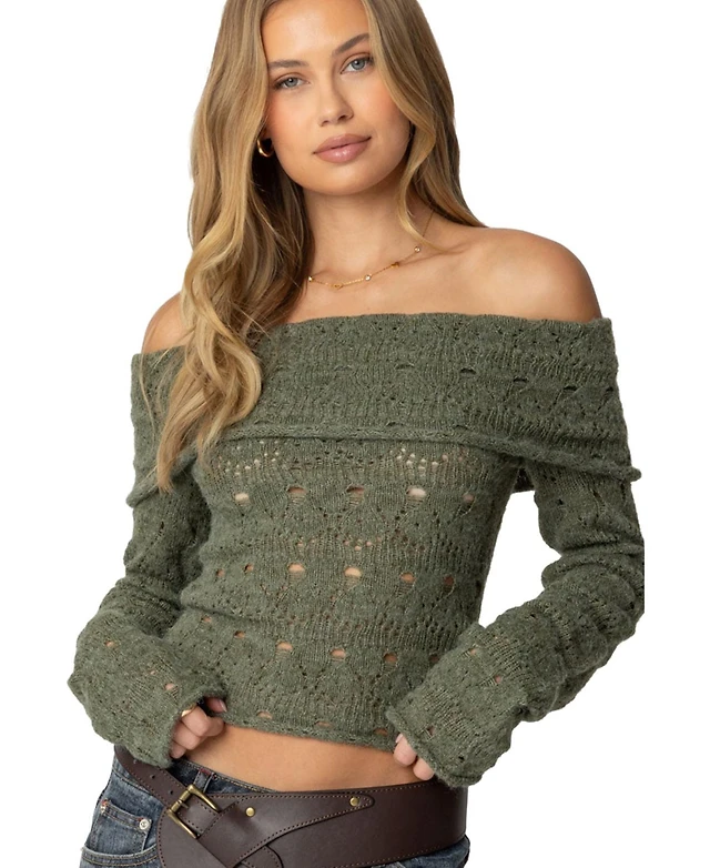Belldini Women's Embroidered Cold-Shoulder Knit Top