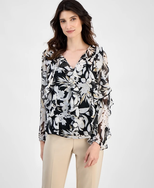 Kasper Women's Printed Ruffle-Front Long-Sleeve Blouse