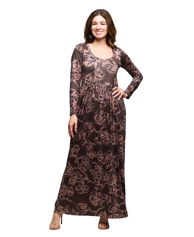 24seven Comfort Apparel Women's Brown Blush Floral Long Sleeve Dress