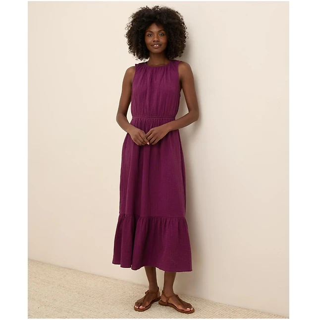 Lands' End Women's Puff Sleeve Pleated Linen Knee Length Dress