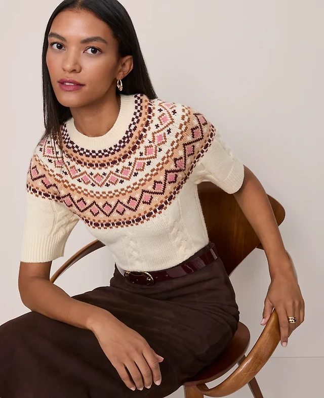 Ann Taylor Fair Isle Cable Sweater T-Shirt Seedpearl Women's