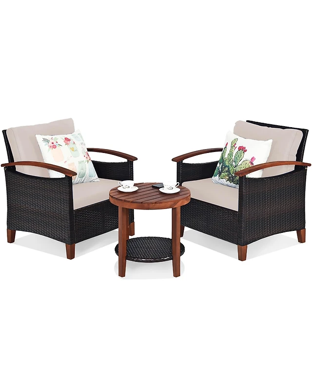 3PCS Patio Rattan Furniture Set Wooden Frame Cushion Table Shelf
