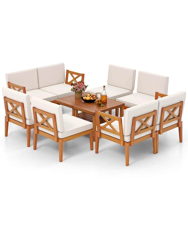 Gymax 8PCS Conversation Set Acacia Wood Sofa Coffee Table w/ Cushioned Seat Patio