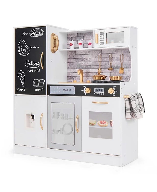 Gymax Play Kitchen Toy Set w/ Chalkboard Oven Sink Curtain Microwave Water Dispenser