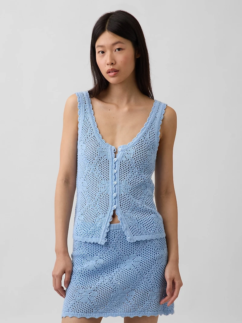 - Soft pointelle knit cotton sweater tank top. In a slightly cropped length.