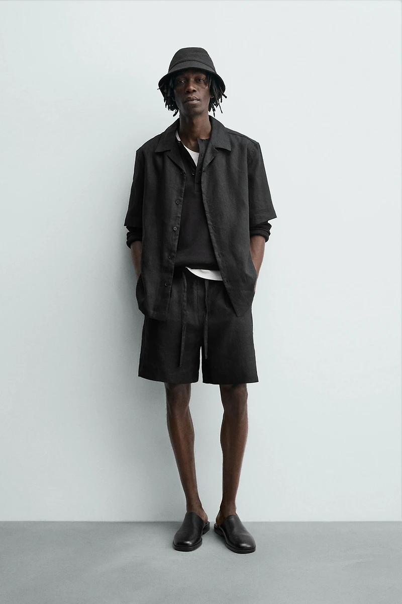 Relaxed fit shorts made of linen fabric. Adjustable elastic drawstring waist. Front pockets and back patch pocket.