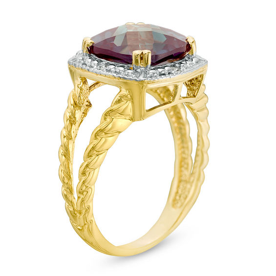 Her eyes will never leave the spellbinding look of this sumptuous fashion ring. Luxe in warm 10k gold, this stunning design captures her attention with an alluring 10. 0mm cushion-cut lab-created violet-purple alexandrite surrounded by an enchanting frame of sparkling diamond accents and intricate beading. Gleaming rope-textured details shimmer along the ringâs enticing split shank, adding dimension in all the right places. A glittering treat for the left or right hand, this brilliant ring is polished to a bright shine.