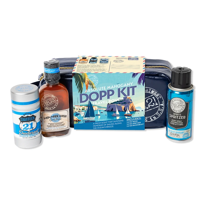 DOPP KIT ABSOLUTE MAHOGANY. Benefits: Simplifies packing for travel.. Ideal for gifting or personal use.. Features: Handsome leather pouch with a vintage look.. Multi-use grooming products.. Compact travel sizes.. Fresh absolute mahogany scent.. Includes: 3-In-1 Man Made Wash (3.4 oz). Spirits Spritzer Body Spray (3.4 oz). Deodorant (2.6 oz).