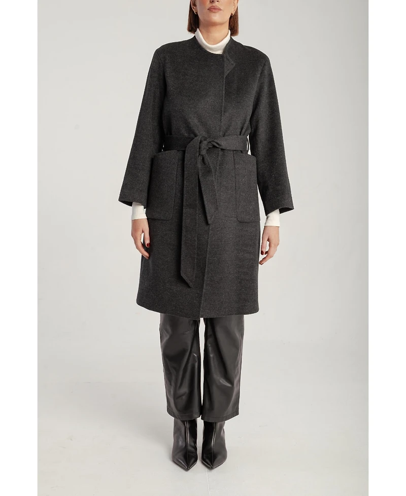 Sumptuous cashmere drapes into a tailored lapel silhouette, cinched by a soft self-belt for luxurious warmth and signature style.