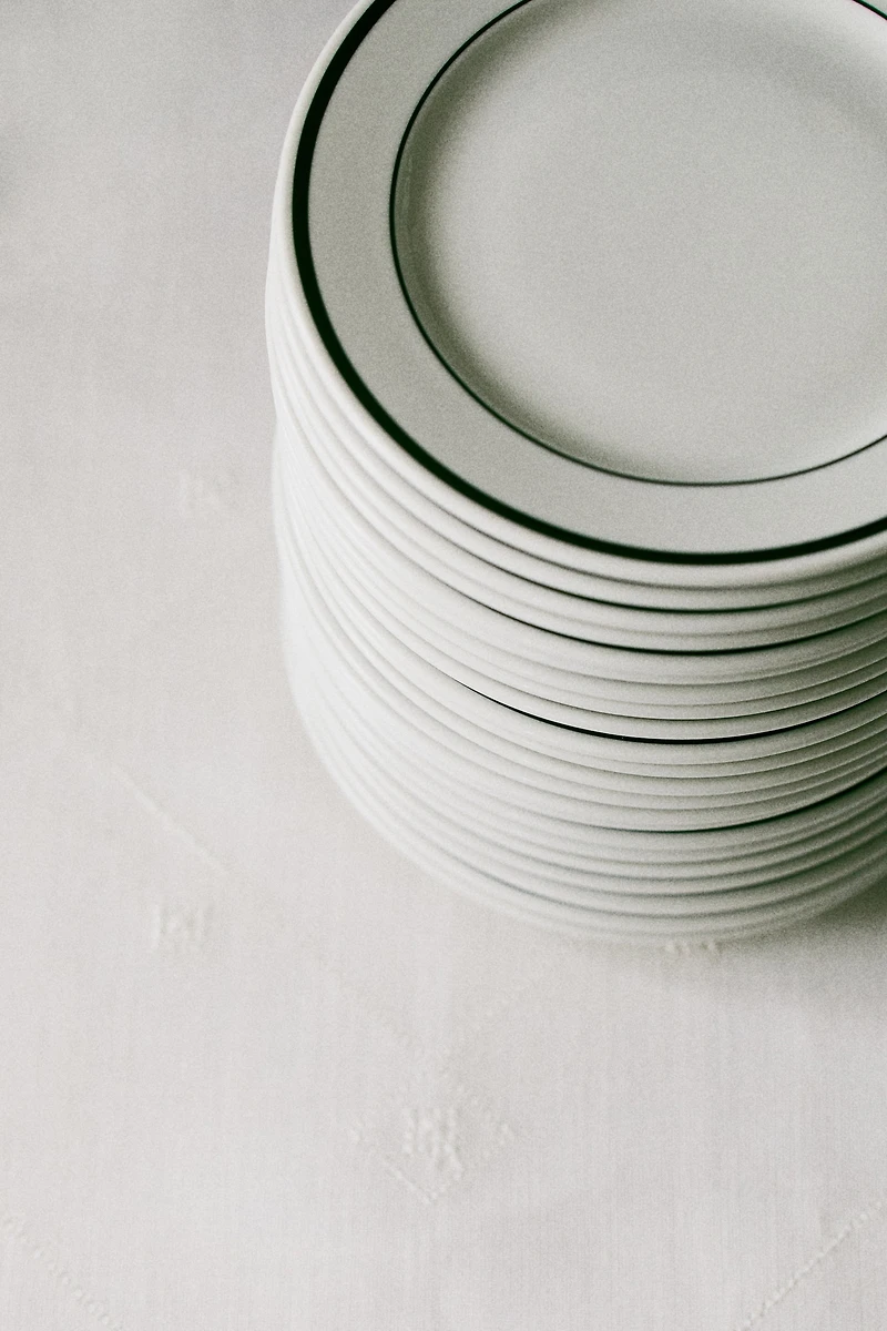 Two medium-sized plates in porcelain with a classic painted rim inspired by cozy French bistros.