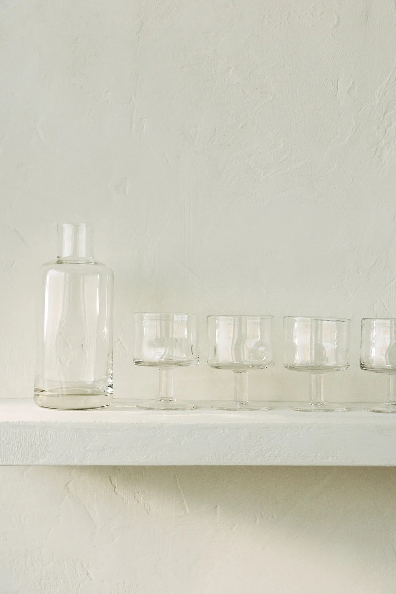 Wine glasses in thick glass with a squared, slightly irregular shape and softly rounded edges. Capacity 8.79 fl. oz.