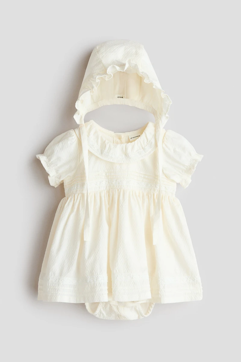 Set in soft, airy woven cotton with a dress featuring an attached bodysuit, and a bonnet. Lace-trimmed dress with pintucks, a round collar, and an opening at back with buttons. Short puff sleeves with elasticized, ruffled cuffs, and gathers above a flared skirt. Bodysuit with narrow, covered elastic at leg openings and snap fasteners at bottom. Lined bonnet with ruffle trim, chin ties, and narrow, covered elastic at back. The H&M Adorables collection is a curated selection of high-comfort, quality pieces with a timeless appeal.