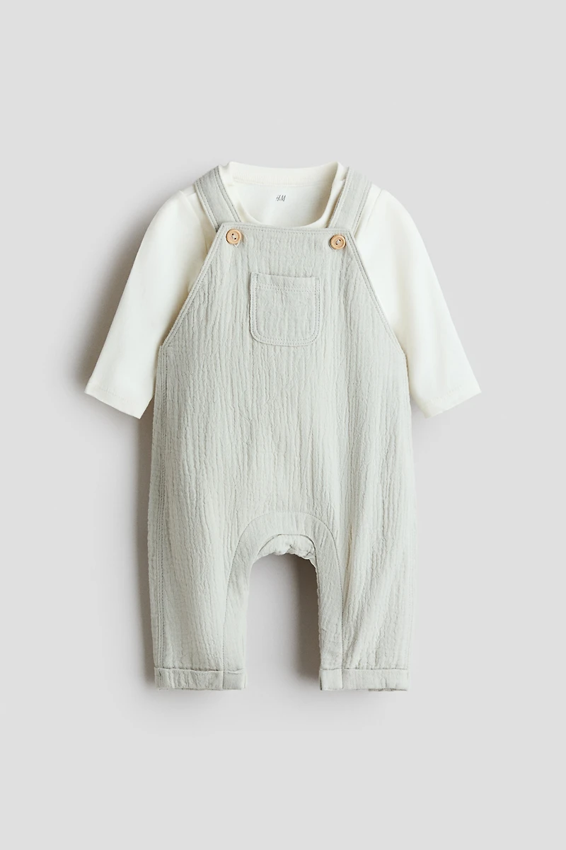 Set with overalls in soft cotton muslin and a bodysuit in cotton jersey. Overalls with adjustable, button-front shoulder straps, bib pocket, concealed snap fasteners along legs, and sewn foldover cuffs. Long-sleeved bodysuit with a round neckline, snap fasteners on shoulders, and snap fasteners at bottom for easy changing.