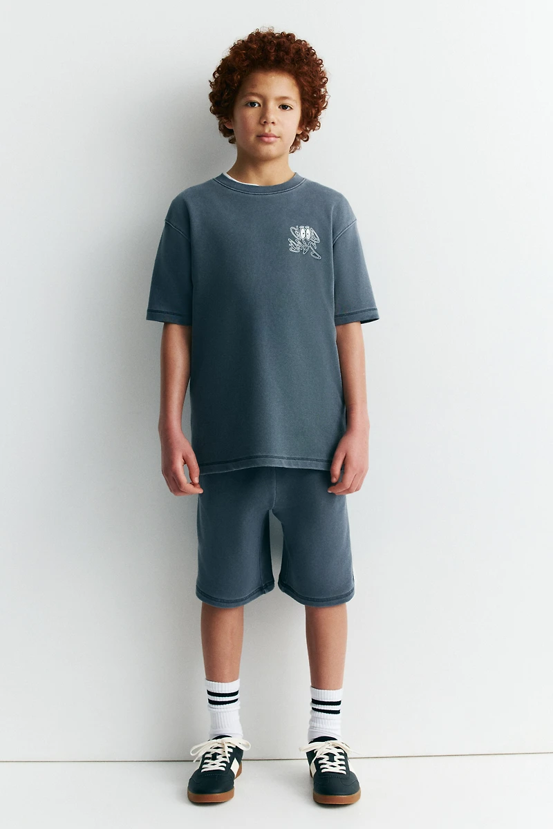 Set in lightweight fabric with a sweatshirt and matching sweatshorts, both with a printed design. Sweatshirt with a ribbed round neck and dropped shoulders. Shorts with an elasticized, drawstring waistband and discreet side pockets.