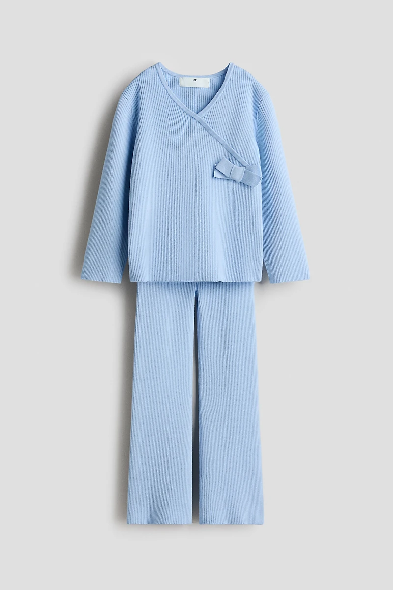 Soft, rib-knit set with a top and leggings. Top with a V-neck, mock wrap-over front with an attached bow, and long sleeves. Leggings with an elasticized waistband and straight legs.