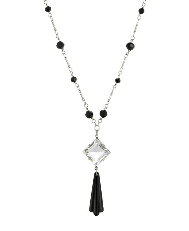 2028 Silver-Tone Diamond Shaped Crystal Flower Black Beaded 15" Adjustable Necklace