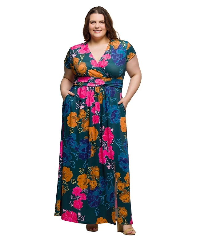 24seven Comfort Apparel Plus Cap Sleeve V-Neck Side Slit Pocket Maxi Dress