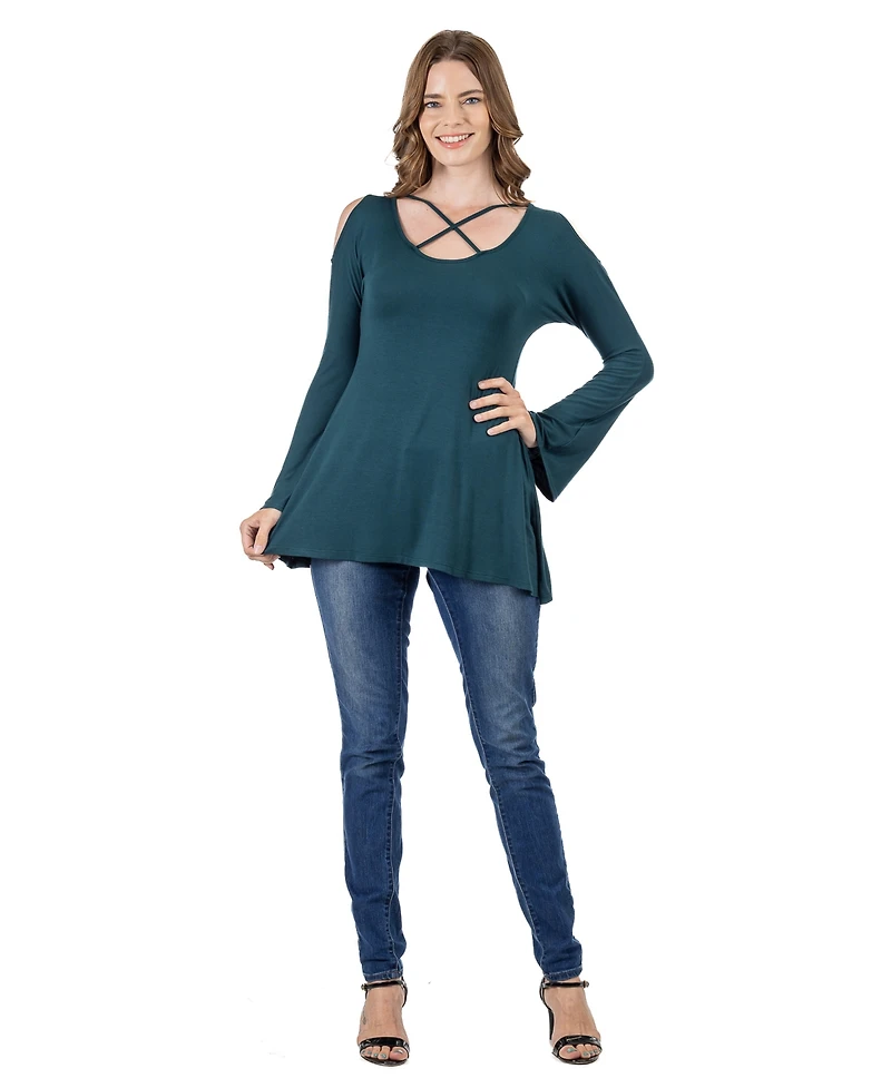 24seven Comfort Apparel Women's Criss-cross Cold Shoulder Long Sleeve Top in Bloomington, MN