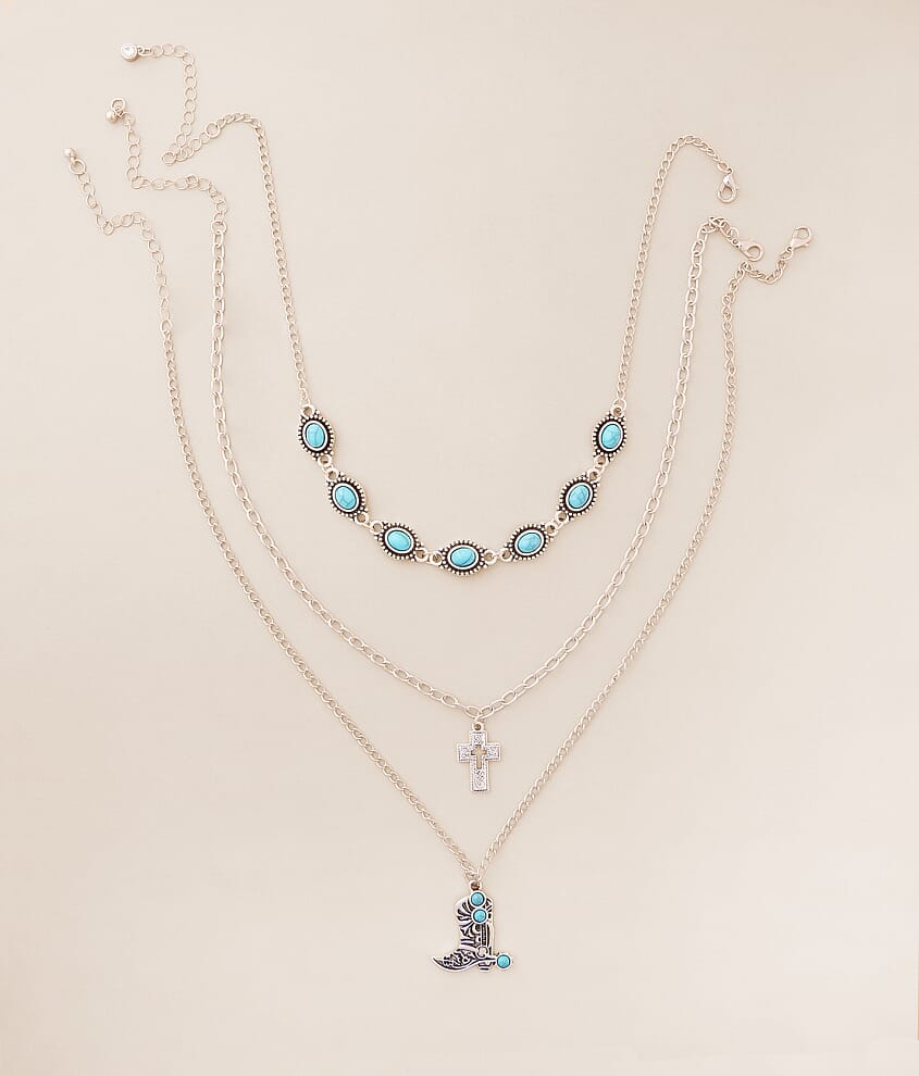 Turquoise stone necklace length measures 18" Cross pendant necklace length measures 19" Turquoise cowboy boot pendant necklace length measures 21 1/2"