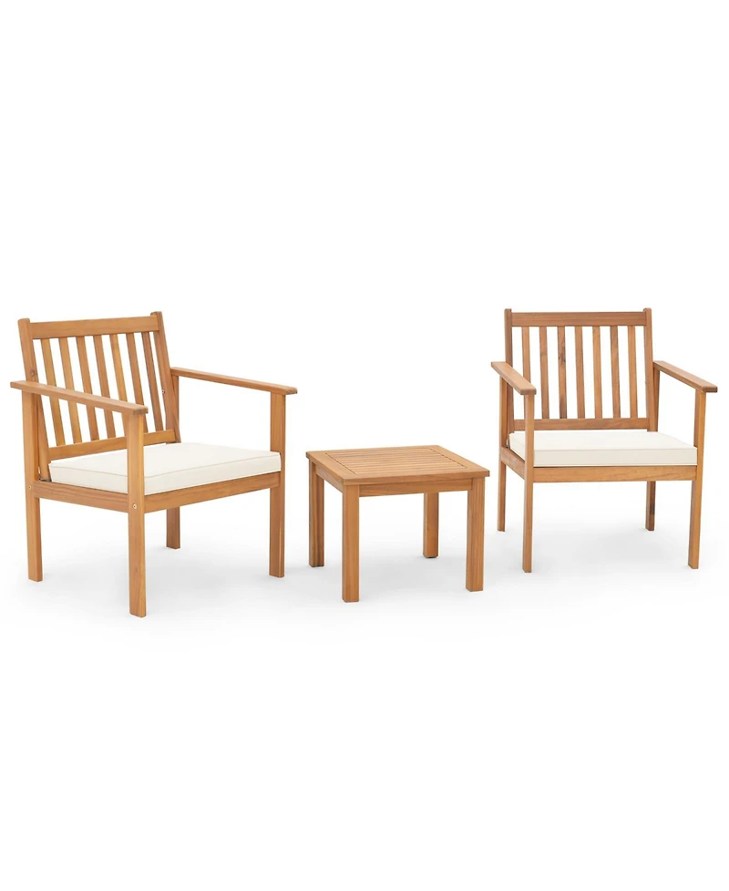 Enhance your outdoor relaxation with this 3-piece patio furniture set, crafted from premium acacia wood. Featuring a coffee table and two comfortable chairs with cozy cushions, this elegant set is perfect for your backyard, poolside, or balcony.