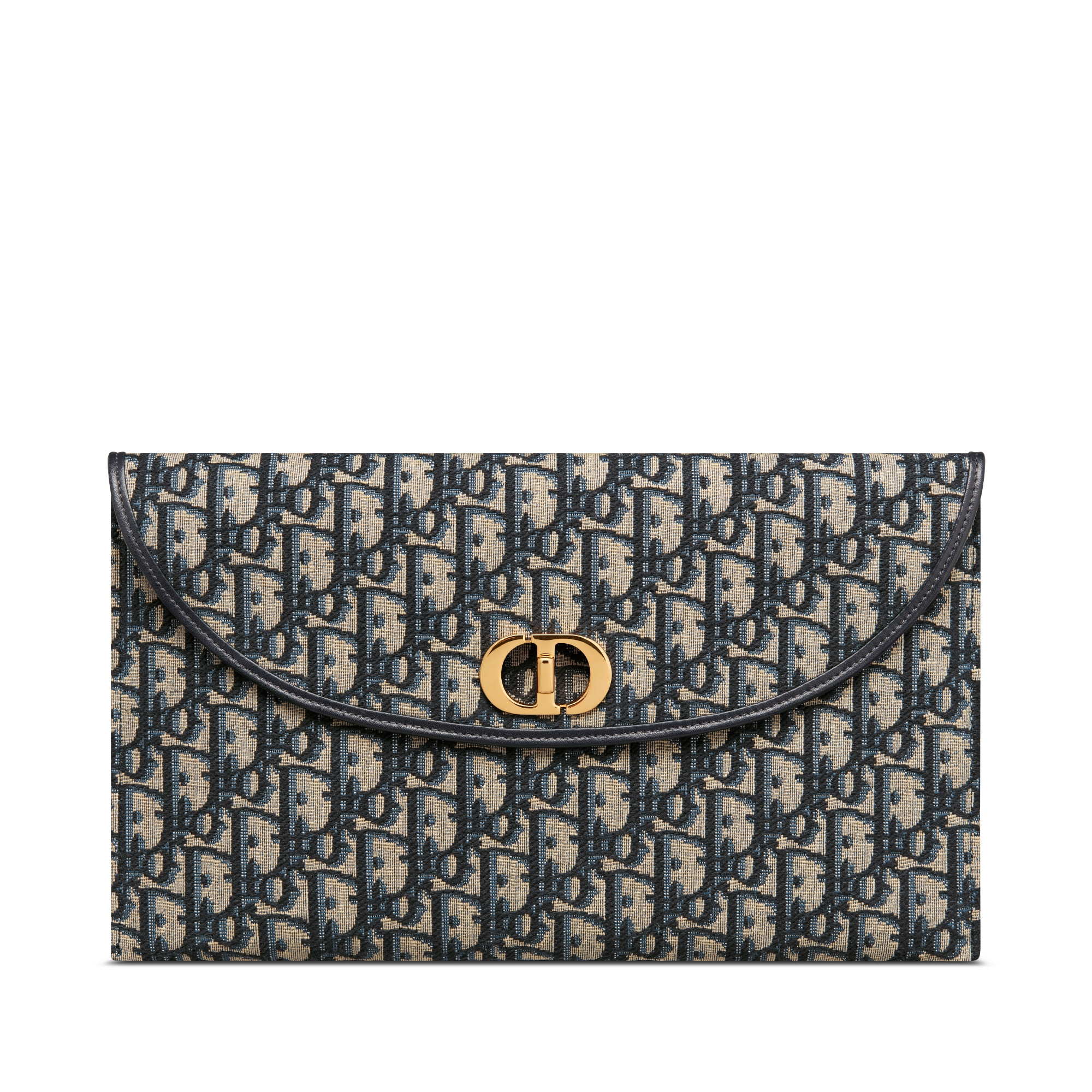 The 30 Montaigne Avenue pouch with flap displays a modern design. Crafted in blue Dior Oblique jacquard, it possesses the codes of its namesake line, including its antique gold-finish metal CD twist clasp on the flap. Embellished with contrasting calfskin details, the pouch will fit anywhere and can be coordinated with other 30 Montaigne Avenue creations.