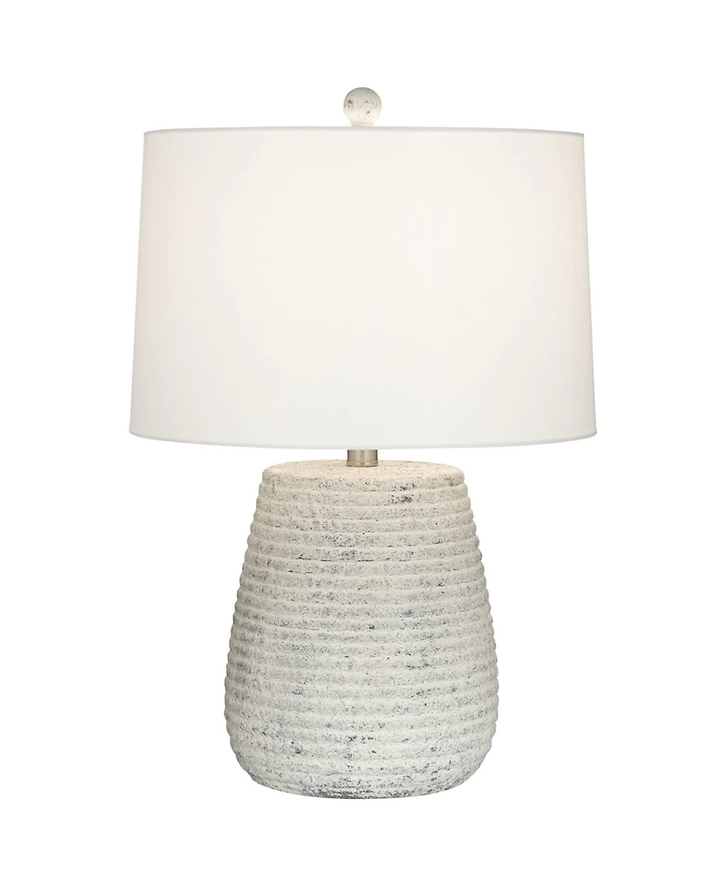 Handcrafted from ceramic, the modern Clastic table lamp by 360 Lighting offers pure style for a wide variety of decors, from Mid-Century and Scandinavian to rustic and coastal. The base comes in a sandstone rock ceramic finish that has a washed-stone look to it. Up top is a white linen fabric lamp shade. Due to the handcrafted design, the color and finish may vary. Ideal for the Japandi interior design trend, a minimalist look that blends Japanese and Scandinavian styles with organic appeal.