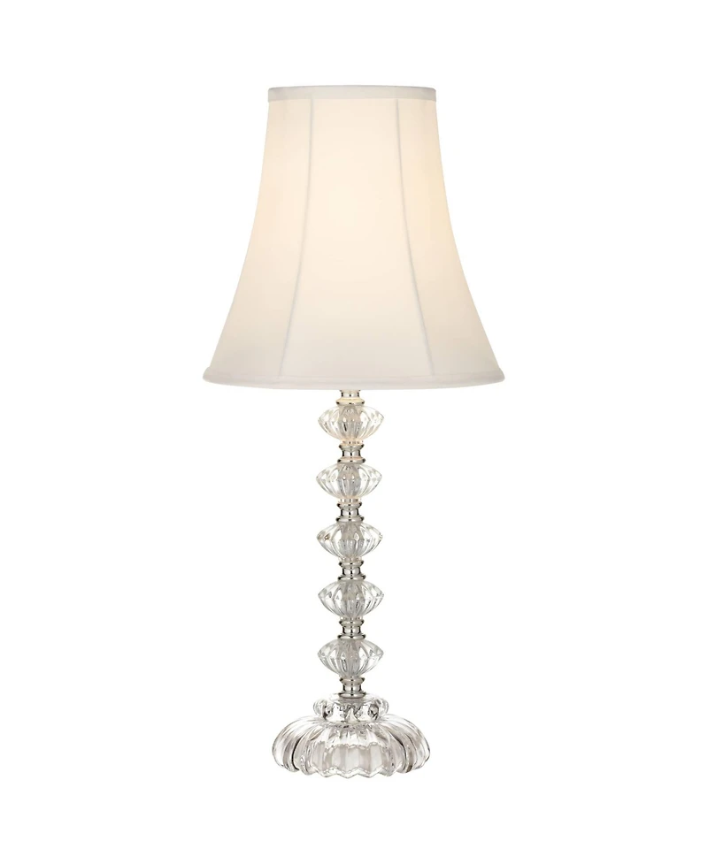An elegant table lamp with a vintage-look, bohemian inspired style. From the 360 Lighting brand, the lamp offers a wonderful accent for living room sitting areas or for bedside tables. It has a clear glass with stacked segment detailing. An bell-shaped, white fabric lamp shade sits up top.