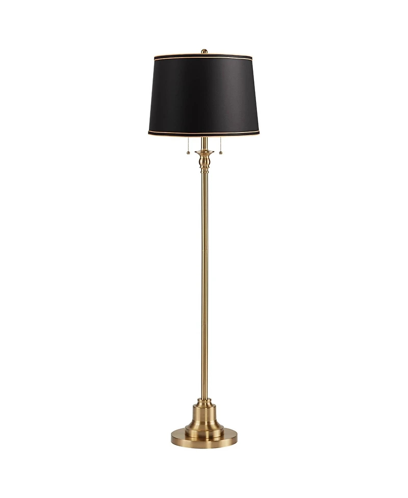 Create the living space of your dreams with the Dyna floor lamp, from the 360 Lighting brand. Perfect for homes blending contemporary and industrial styles, this antique brass finish floor lamp comes with a satin black fabric drum shade with gold trim and interior. Twin pull-chains easily operate two bulbs, bringing welcome illumination to your home.