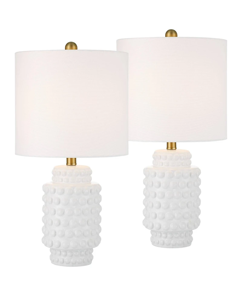 The Hobnail set of table lamps offers a contemporary look for your decor. From the 360 Lighting brand, the pair of lamps have a textured, raised hobnail pattern on the white ceramic bases. Up top are white fabric drum shades that complete the look.