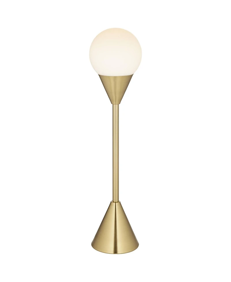 This modern accent table lamp adds a luxurious look to side tables and more. From the 360 Lighting brand, it features a tall and slender metal column done in a bright brass finish. At the top is the column is a white glass globe, which can be easily illuminated by using the handy in-line on-off switch that's on the cord.