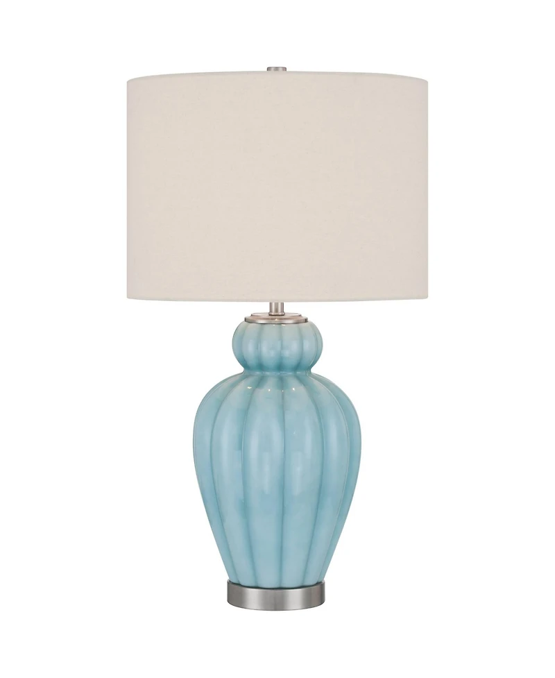 The soft, cool color tones of the Leros table lamp, from the 360 Lighting brand, are perfect for bringing a feel of calm and relaxation to your home's living space. The blue sky finish glass base is inspired by natural shapes with a fluted gourd design, accented by a nickel finish base foot for a slightly modern touch. This design takes a three-way bulb to match it's three-way rotary socket switch, allowing two distinct brightness settings, housed under an off-white fabric drum shade.