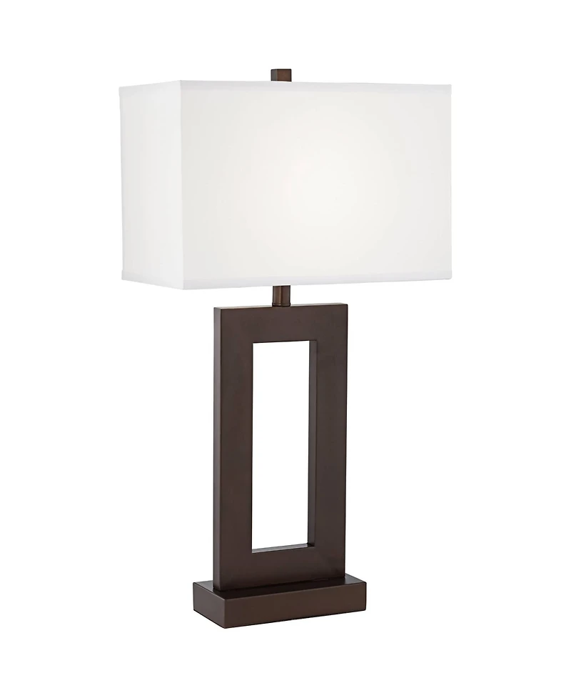 A simple and modern design featuring an open rectangular base design in a contemporary bronze finish that is complimented the crisp white box shade above. A small finial at the top adds subtle style. By the 360 Lighting brand, this lamp also comes with a tabletop line cord dimmer, which allows you to control the level of lighting. The dimmer has a handy Usb charging port for charging phones and more. Simply insert the lamp plug into the dimmer outlet, and then slide the switch on the control to dim or brighten the lighting.