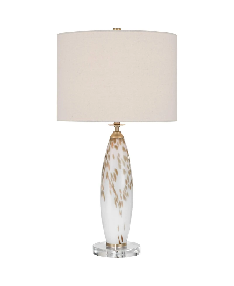 Give your living space a glow up with the Melina mid-century modern glamorous glass table lamp, presented by the 360 Lighting brand. The slender base of this design features a white finish backdrop with a beige finish pattern, resembling sand and snow. Brass finish accents bring out subtle glamor, paired against the off-white fabric drum shade and 3-way bright bulb. The perfect lamp choice to enhance your home's interior appeal.