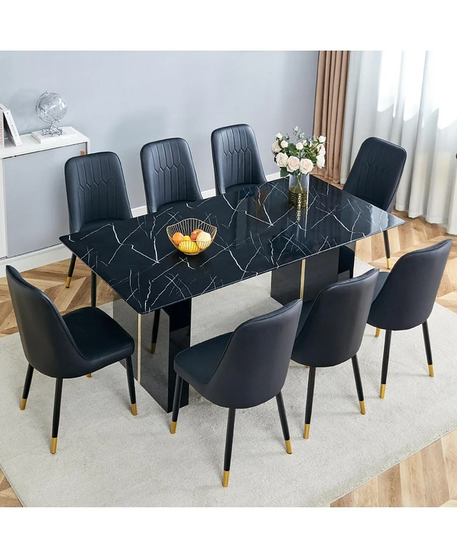 Modern Glass Dining Set: Marble Table & 6 Black Pu Chairs