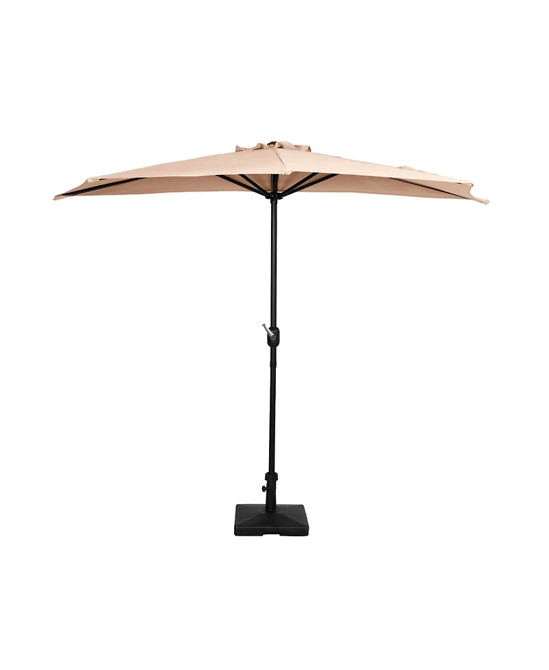 Stay out the sun with this half market umbrella and base set. Raise the umbrella with the simple hand crank to open and close the umbrella in seconds to block out the sun on those warm days. The half umbrella is perfect for a balcony, porch, or small patio to place against the wall and cover you.