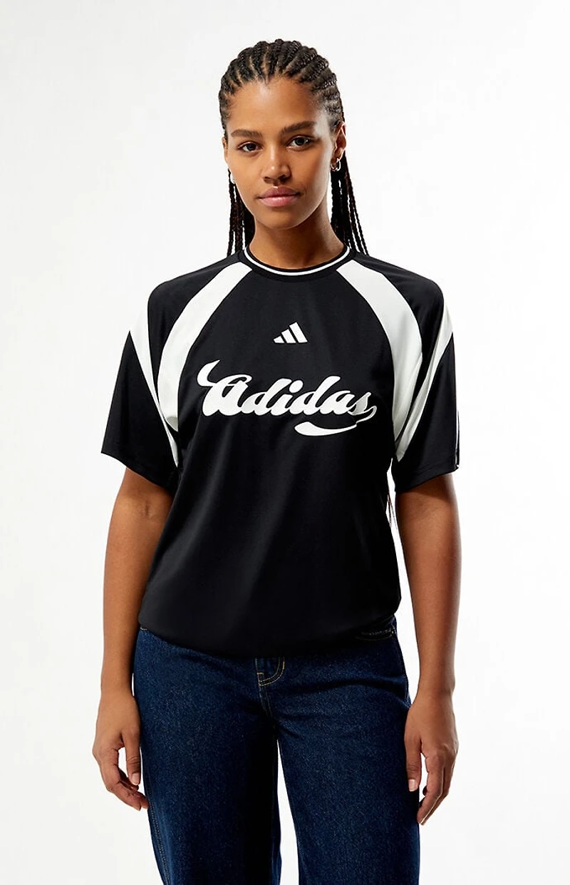 The Black & White Her Short Sleeve Jersey from adidas brings a fresh, sporty vibe to your everyday rotation. Made from recycled fabric, this top features short sleeves, a classic crew neckline, bold adidas graphics, and contrast stripes along the sleeves. Finished with a relaxed fit, it’s an easy go-to for laid-back, athletic style.