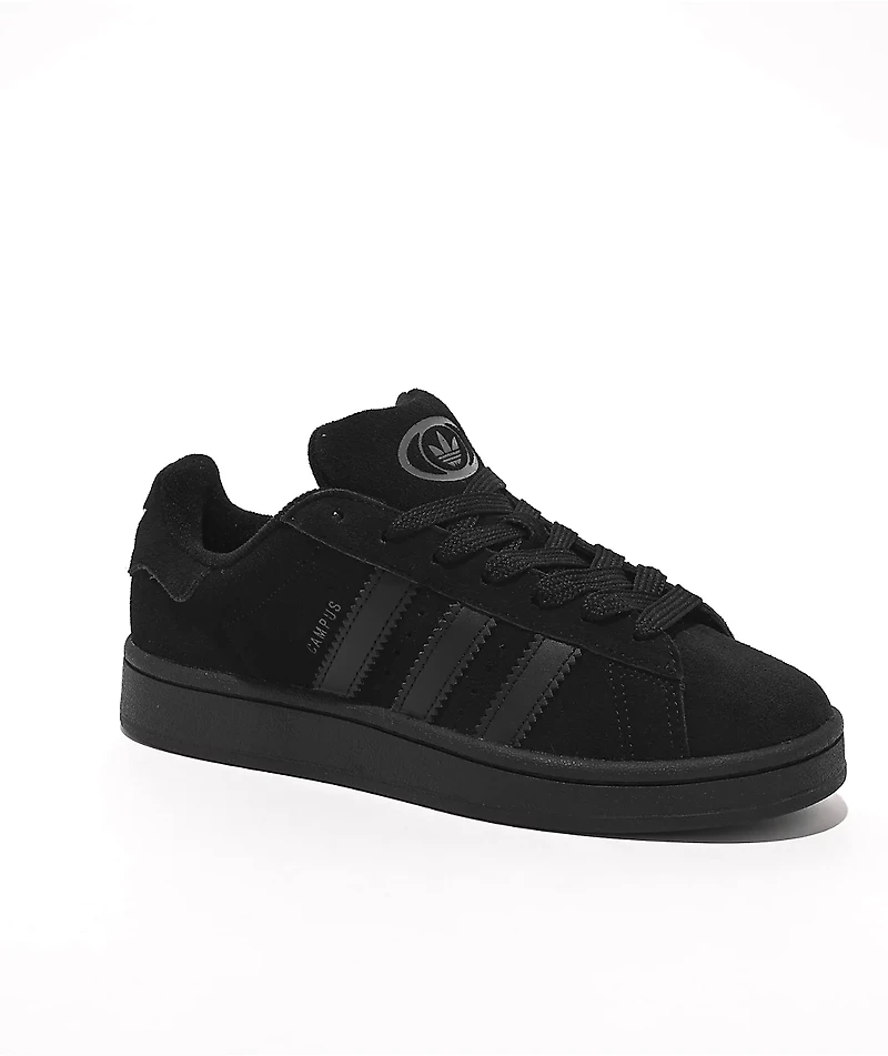 The classic campus 00s skate shoes from adidas Originals arrive in kids sizing and a sleek all black colorway. Branding throughout the suede upper, including a leather 3-stripe design on the sidewalls, lends the sneakers a stylish vibe. A puffy tongu