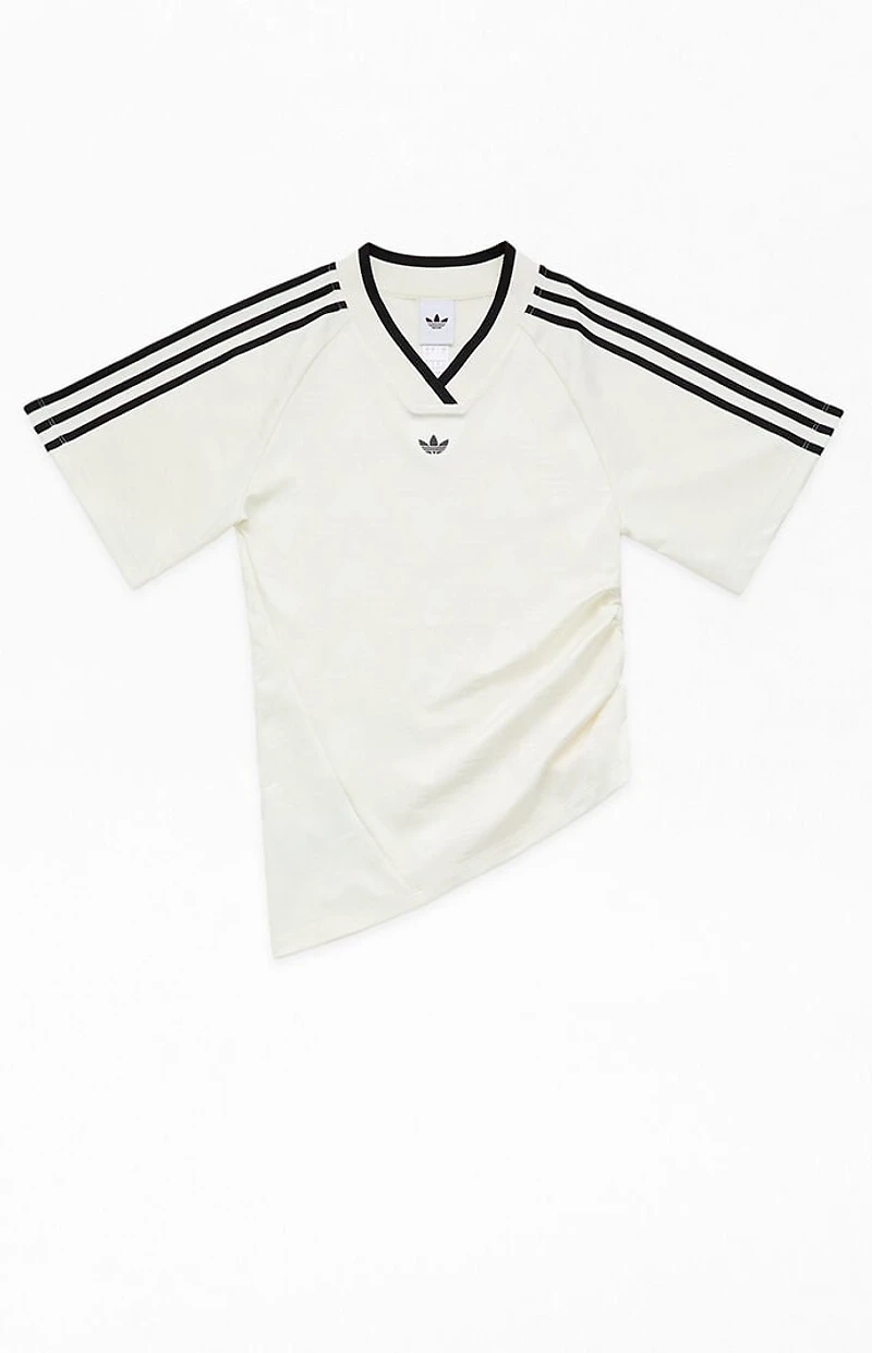 The Ruched Short Sleeve Football Jersey from adidas brings a fresh twist to a sporty classic. Made from recycled fabric, it features a V-neckline, short raglan sleeves, ruched details, an adidas Trefoil logo at the front, and an asymmetrical hemline for a standout, modern look.