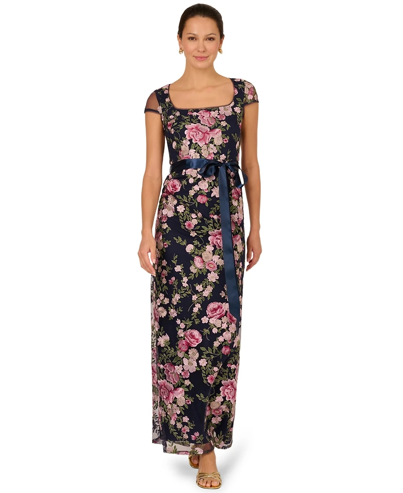 Grace every occasion with elegance in this women's cascading floral sheath gown from Adrianna Papell, complete with a delicate ribbon tie at the waist for a timelessly flattering silhouette.