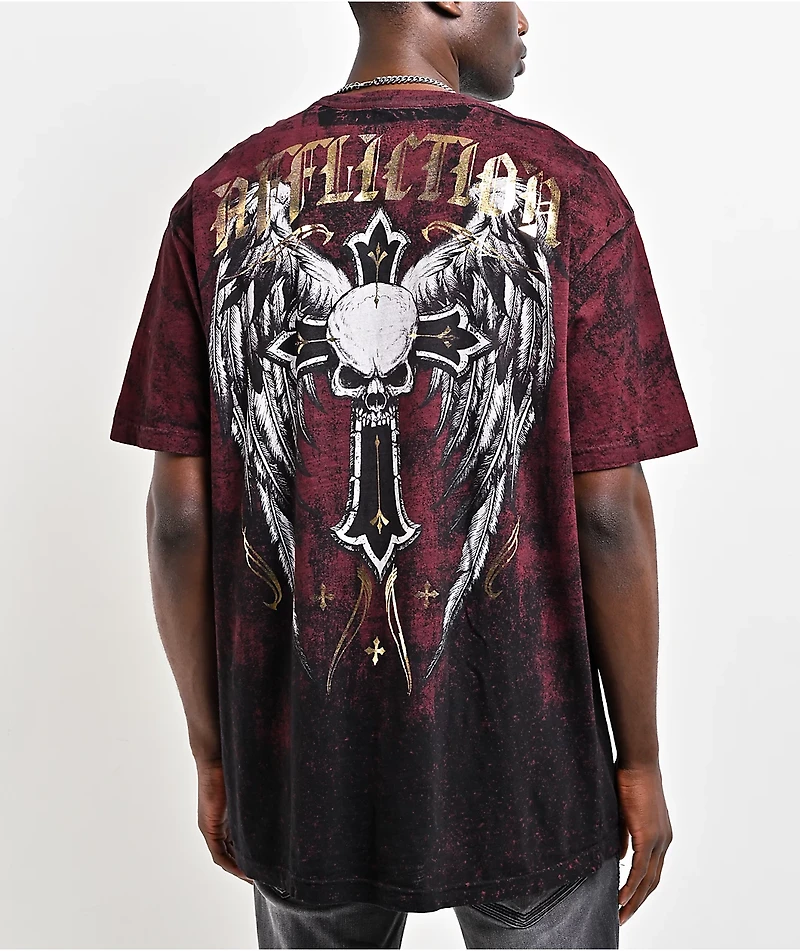 The Prophet t-shirt from Affliction arrives in a deep red wash with dark grungy shading throughout. The chest displays Affliction branding above a skull and gothic cross design, while the back expands on the theme with a large image framed by dramati