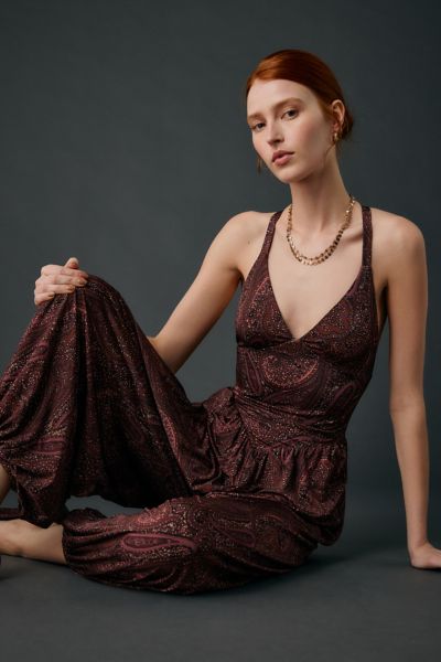 Vintage-inspired paisley print mesh AFRM jumpsuit designed in a dramatic balloon leg silhouette. Long jumpsuit designed with a plunging v-neckline, tank straps, drop-waist bodice, v-shape waistline and wide legs with cinched hems. Finished with a low open back with crisscross straps making it a standout choice for any occasion.