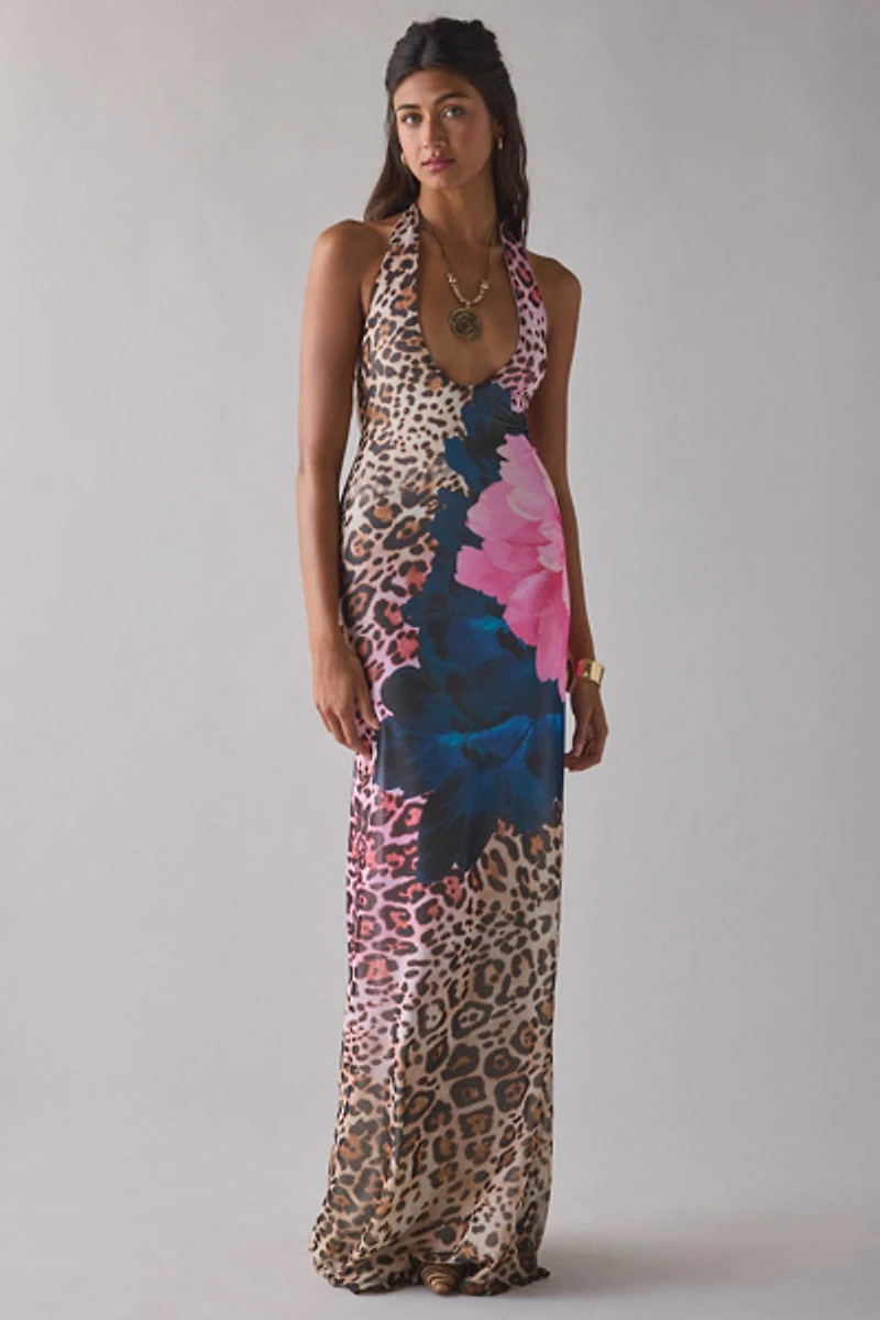 AFRM Paisleigh Animal Block Peony Mesh Halter Maxi Dress