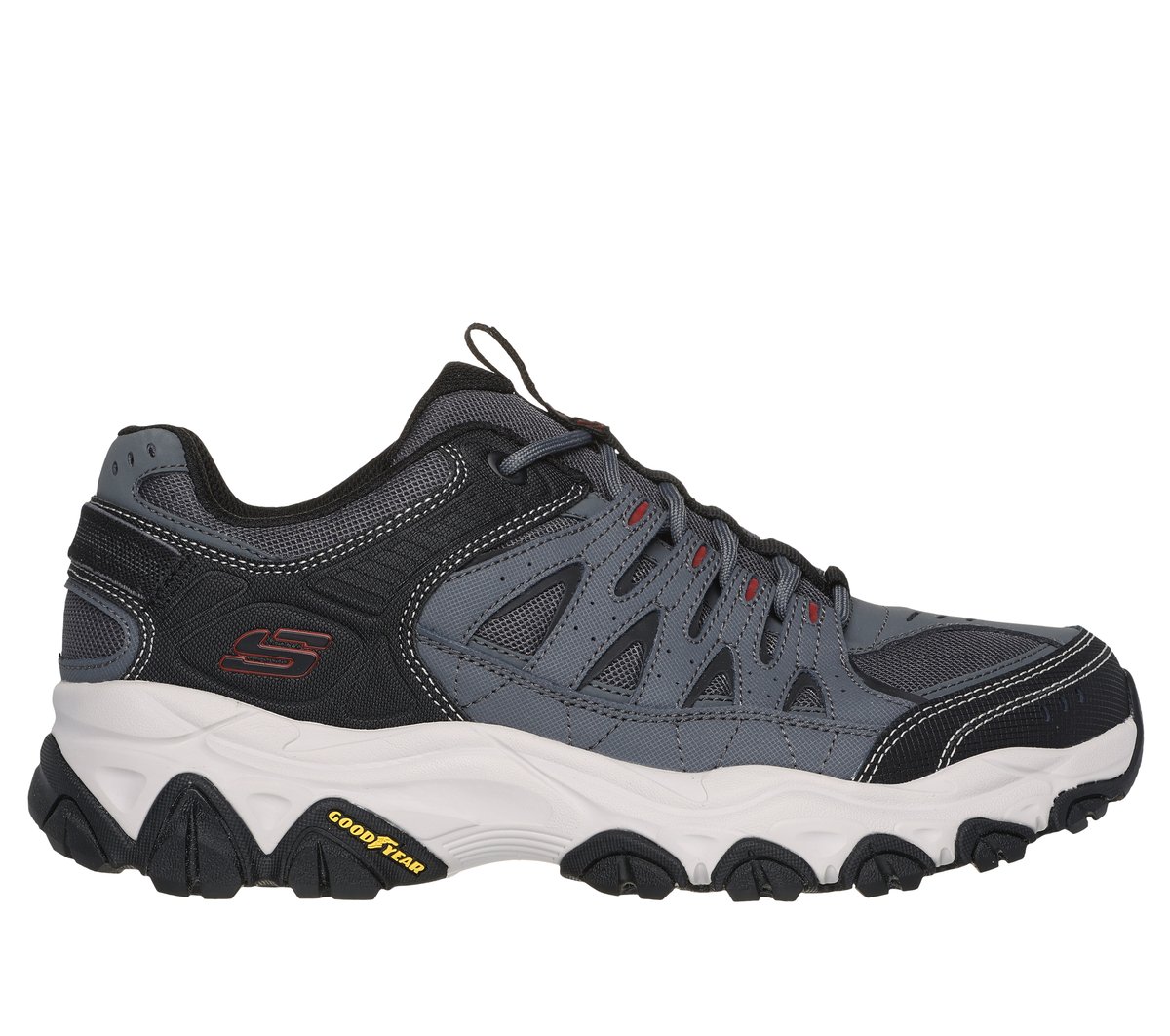 Explore wild terrain in comfort with Skechers After Burn M.Fit 2.0. This lace-up outdoor trail design features a leather, synthetic and mesh upper with a cushioned Skechers Memory Foam™ insole and Goodyear® Rubber Outsole.