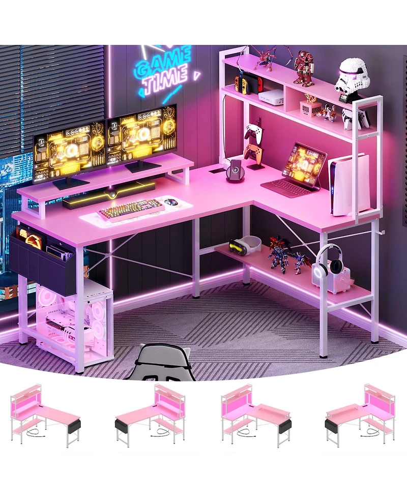 Gaming Desk / L Shaped Computer Desk / Home Office Desks with Power Outlets and Led Strip. This small L shaped gaming desk includes 1 spacious desktops that can easily paccommodate 2 monitors. The 4 tiers side storage shelves maximally provide ample storage space for your Pc case, books, files, game devices. Moveable monitor stand design help you keep in a ergonomic sitting position, it could also be placed on the storage side to create a 5-tier storage shelf. It features 2 Tiers Top-table Storage Shelves to maximizes storage space for books magazines gaming gears and other office suppies. The L desk is reversible and the top hutch can be fixed on the left or right side according to your needs, fits perfectly any places in a corner, which maximize your limited spaces. If you want a computer desk with large storage place, and your home space is relatively small, this corner desk is your best choice.