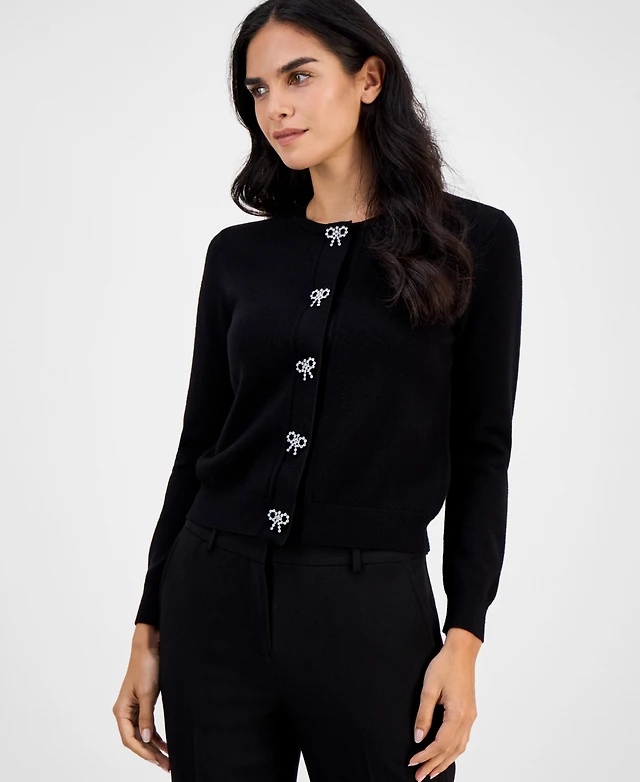 Ak Anne Klein Petite Round-Neck Embellished-Bow Cardigan Sweater