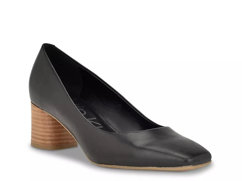 Carry a contemporary look that smoothly transforms from day to night with the Alanta pump from Calvin Klein. The smooth upper with glossy finish and square toe design highlights this slip-on styled with a chunky self-covered block heel for a classy appeal.
