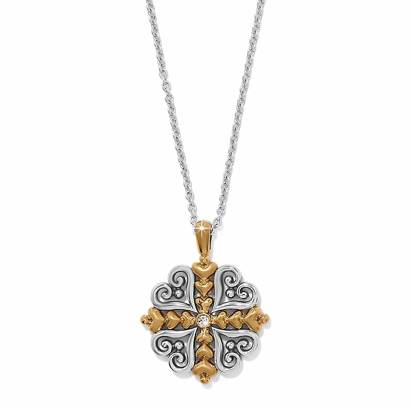 A true classic gets an update with a two-tone finish. The pendant encompasses gold hearts that form a shape reminiscent of a cross. Within that cross shape sit four hearts finished in silver.