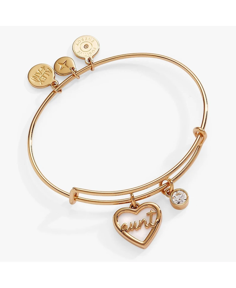 Celebrate the unwavering support and love of an aunt with this thoughtful expandable wire bracelet. Featuring a heart-shaped Mother of Pearl charm with ""Aunt"" raised in gold-tone or silver-tone metal, this piece is paired with a sparkling clear crystal charm. Known for its nurturing and protective energy, Mother of Pearl adds a meaningful touch to a bracelet that honors one of your greatest supporters. Fits wrists 6""-8"".