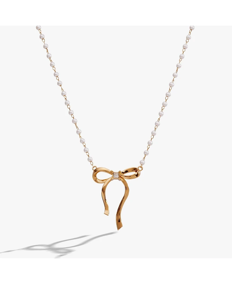 Embrace timeless elegance with this refined pearl necklace, featuring lustrous white pearl beads strung on a delicate rosary chain. A gold-plated dimensional bow adorned with a sparkling clear crystal princess cut stone serves as the striking centerpiece. The intricate craftsmanship delivers an understated luxury that transcends occasion-equally at home layered with everyday pieces or paired with evening wear. A contemporary take on classic femininity, this versatile design bridges modern sensibility with enduring sophistication.