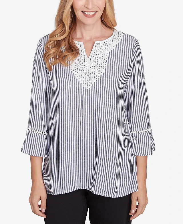 Alfred Dunner Petite Classics Embroidered Split Neck Striped Top